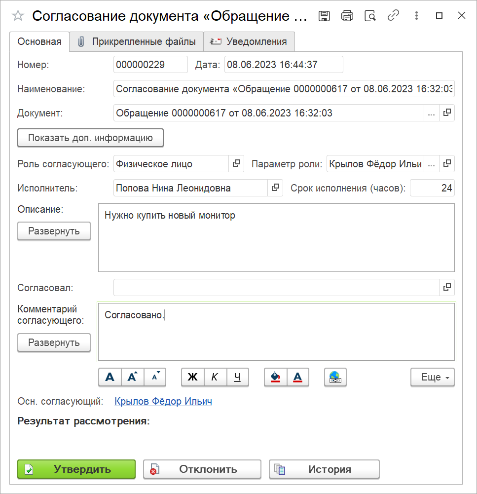 Обработка типовых запросов на обслуживание может потребовать согласования обращений. «1C:ITILIUM» содержит функциональные возможности для организации различных схем согласования, автоматического информирования всех его участников и изменения состояния обработки обращения по результатам этого согласования.