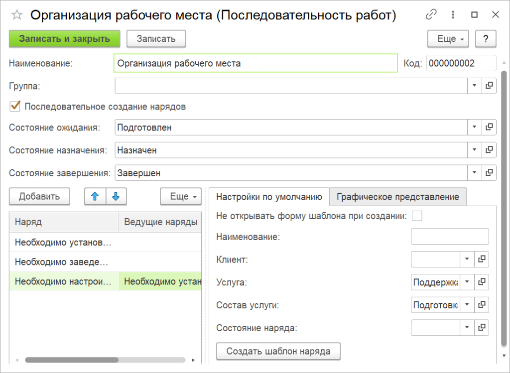 В «1C:ITILIUM» можно создавать последовательность работ – параллельные и последовательные цепочки нарядов, настроенные в зависимости от ожидаемых результатов их выполнения. Это помогает адаптировать процесс управления работами для конкретных условий, не прибегая к конфигурированию средствами технологической платформы «1С:Предприятие».
