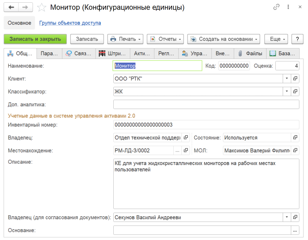 Управление сервисными активами и конфигурациями позволяет иметь в «1C:ITILIUM» актуальную и достоверную информацию обо всех конфигурационных единицах. Для выполнения этой задачи в системе реализована специализированная конфигурационная база данных (CMDB), которая помогает настроить и обеспечить оперативное управление этими данными, хранение их в актуальном состоянии и ведение истории всех изменений, а также дает возможность интеграции с системами аудита и мониторинга инфраструктуры и предоставления этой информации различным потребителям услуг (заказчикам).