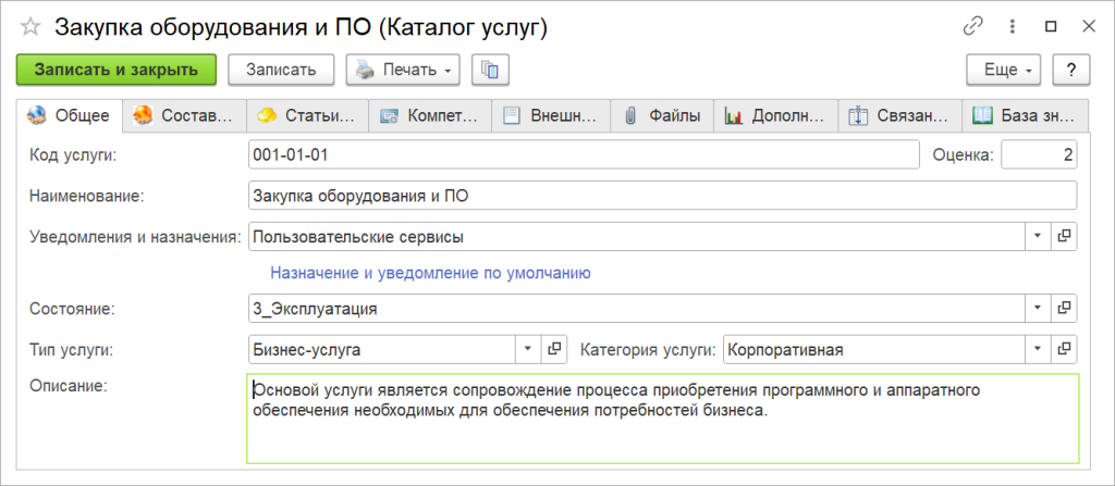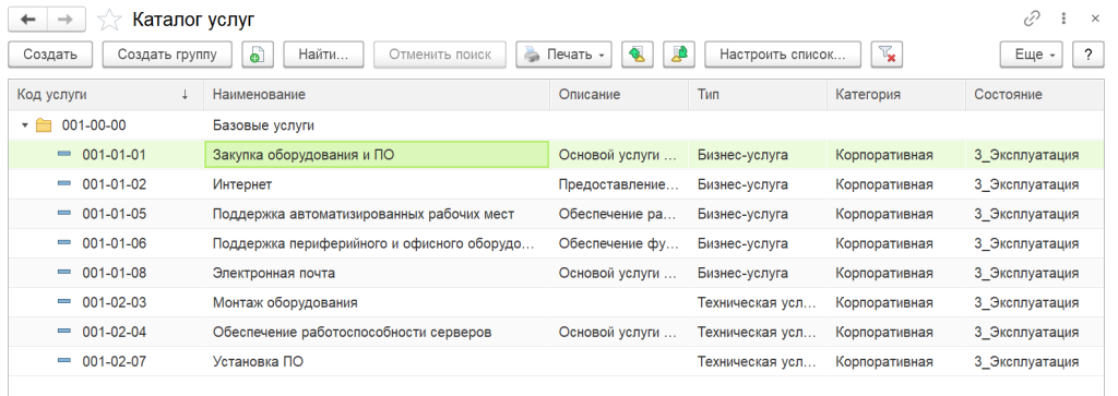 Каталог услуг – ключевой справочник для управления ожиданиями пользователей и функциональных заказчиков, оценки качества услуг и организации процессов управления сервисами, представляющий описание полного перечня услуг. «1C:ITILIUM» позволяет создавать и вести каталог услуг с учетом стадий жизненного цикла услуги, храня информацию как о предоставляемых услугах, так и о тех, которые находятся в разработке или уже не используются.