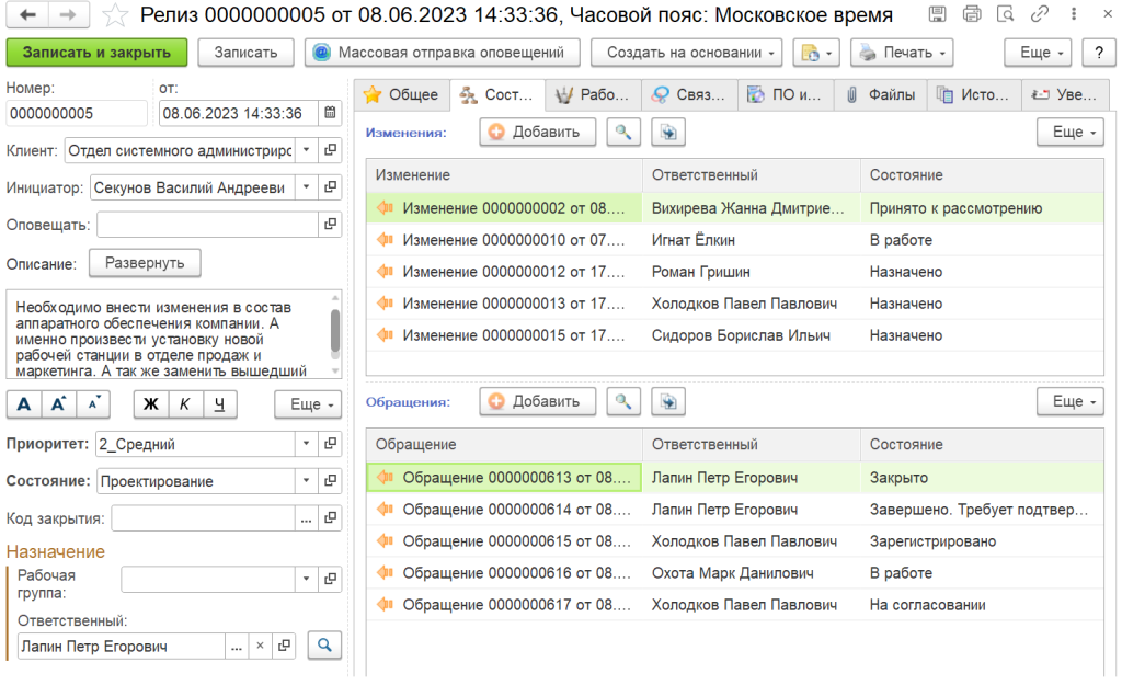 «1C:ITILIUM» содержит следующую функциональность для решения задач по управлению изменениями: