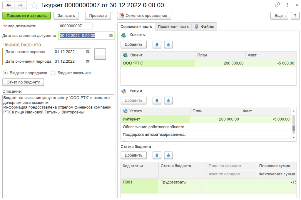 Документ «Бюджет» предназначен для ведения бюджета доходов и расходов организации поставщика услуг, либо бюджета ИТ или сервисного подразделения с возможностью учета проектных работ.