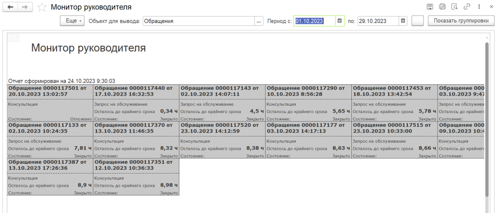 Оперативная отчетность по процессу управления обращениями, которая может обновляться автоматически с заданной периодичностью, позволяет операторам и менеджерам контролировать обработку всех обращений в режиме реального времени.