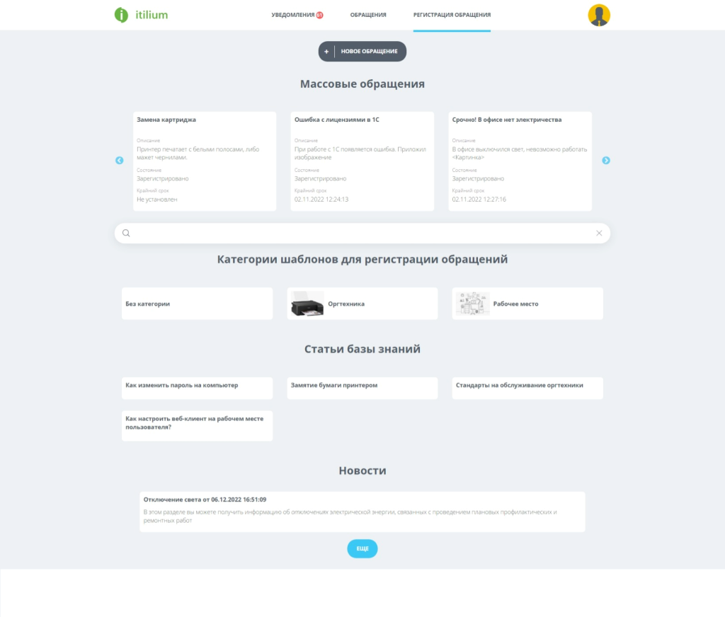 Портал служит в качестве личного кабинета для потребителей услуг и позволяет организовать работу с внешними и внутренними клиентами через веб-интерфейс. С помощью портала можно создавать обращения, просматривать их, отслеживать ход работ, оценивать их качество, а также поддерживать связь с исполнителями и ставить оценки по выполненным обращениям. Кроме того, на портале можно организовать базу знаний с часто задаваемыми вопросами, а через раздел «Новости» оперативно информировать пользователей в случае массовых инцидентов, что помогает снизить нагрузку на техподдержку.