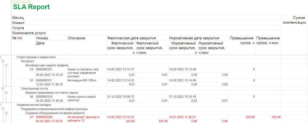 - аналитическую отчетность, которая формируется за произвольные периоды, имеет различные формы настройки и позволяет анализировать результаты всех процессов предоставления услуг, использование конфигурационных единиц и деятельность персонала;