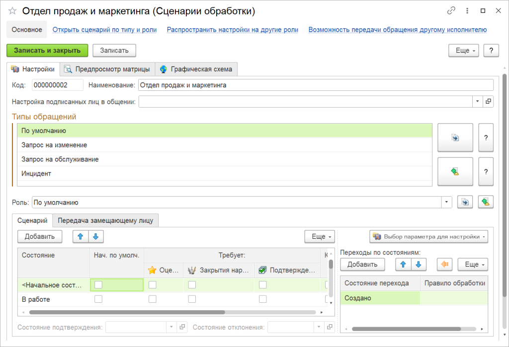 Поступающие обращения могут быть классифицированы как инциденты, запросы на обслуживание, запросы на изменение и при этом обрабатываться в рамках единого процесса. «1C:ITILIUM» позволяет настроить различные сценарии обработки обращений, определяя статусы обработки для каждого типа обращений.
