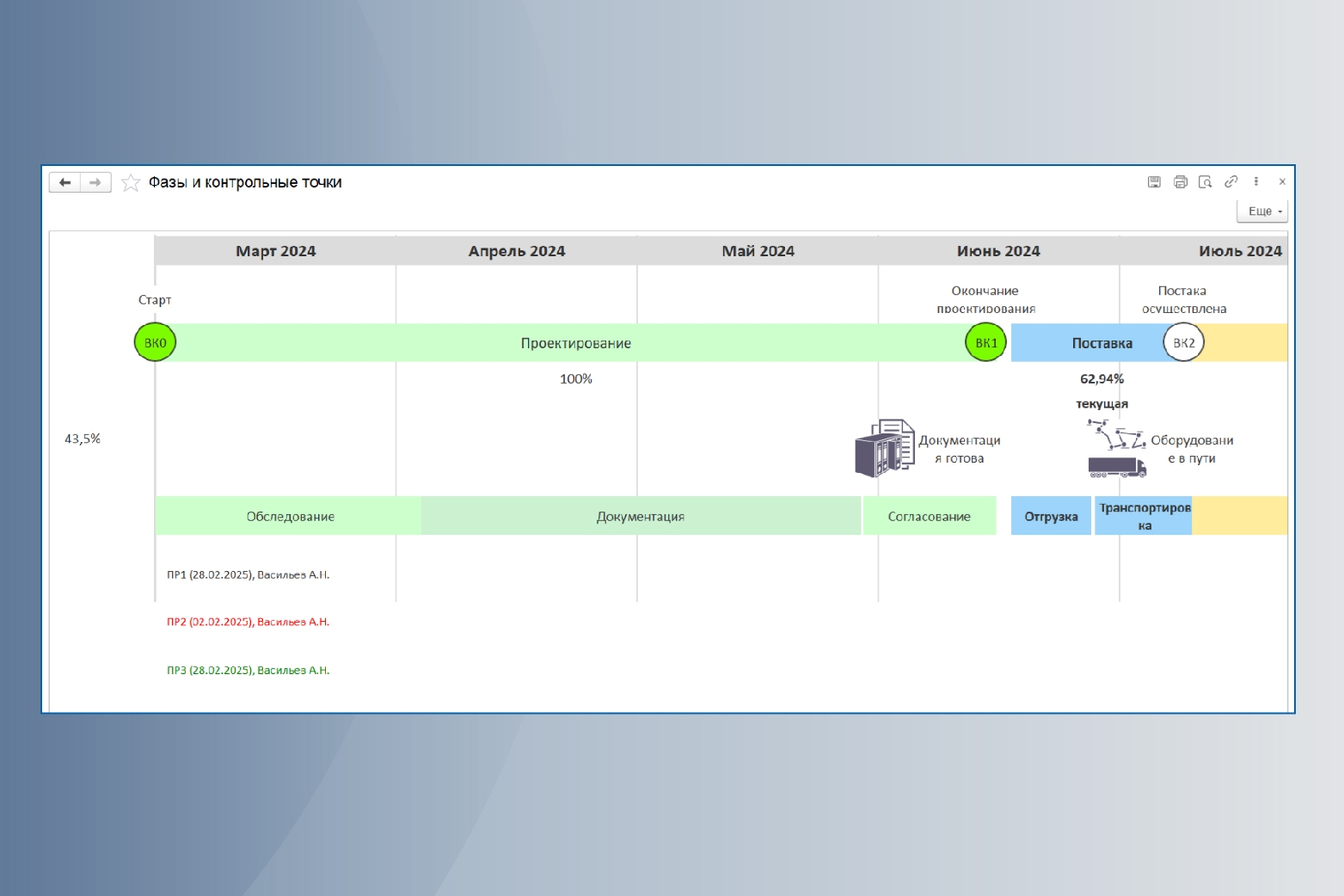 • Визуализация связанных контрольных точек и фаз проекта с KPI фазы.