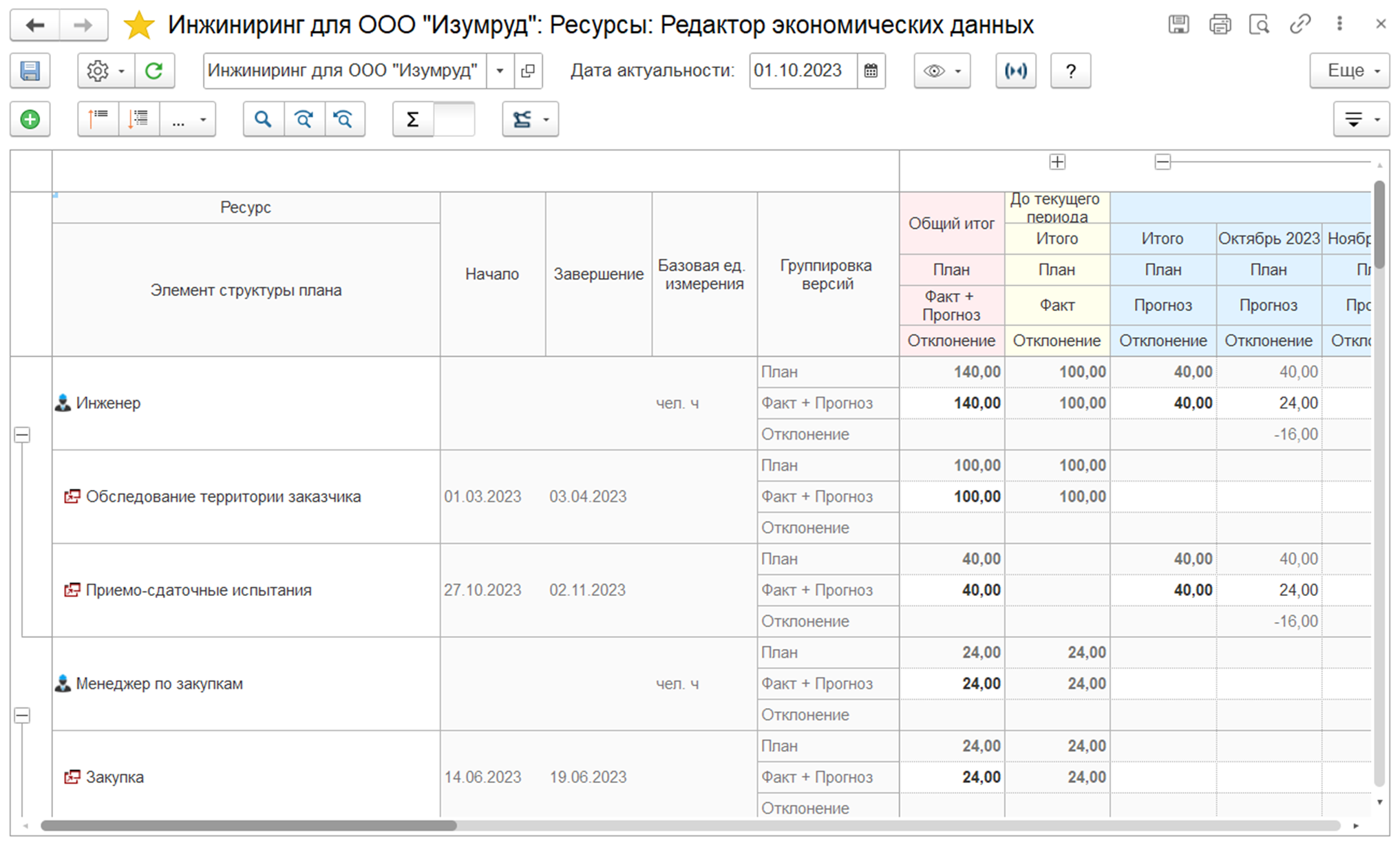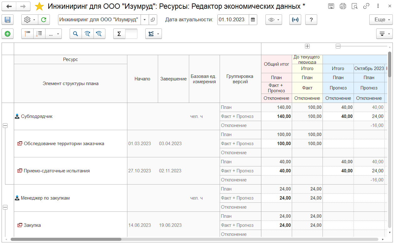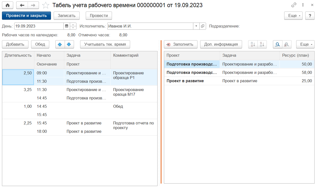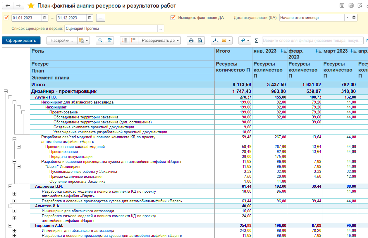 • Отражения факта трудозатрат по проектам в разрезе задач.