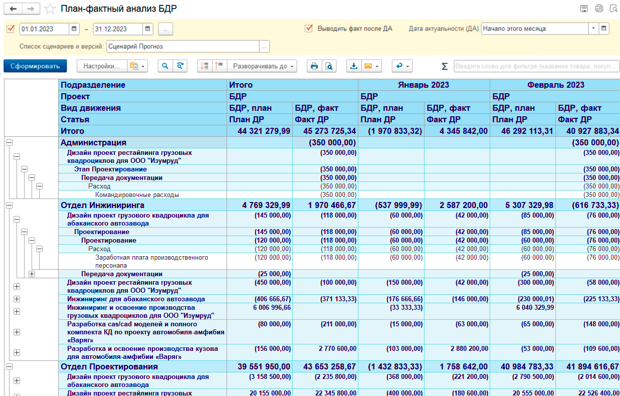 • Обмен данными с «1С:Бухгалтерия предприятия»: выгрузка сводной информации из «1С:Бухгалтерия предприятия» в «1С:PM Управление проектами ПРОФ» с целью получения фактических данных по БДР, БДДС проектов;