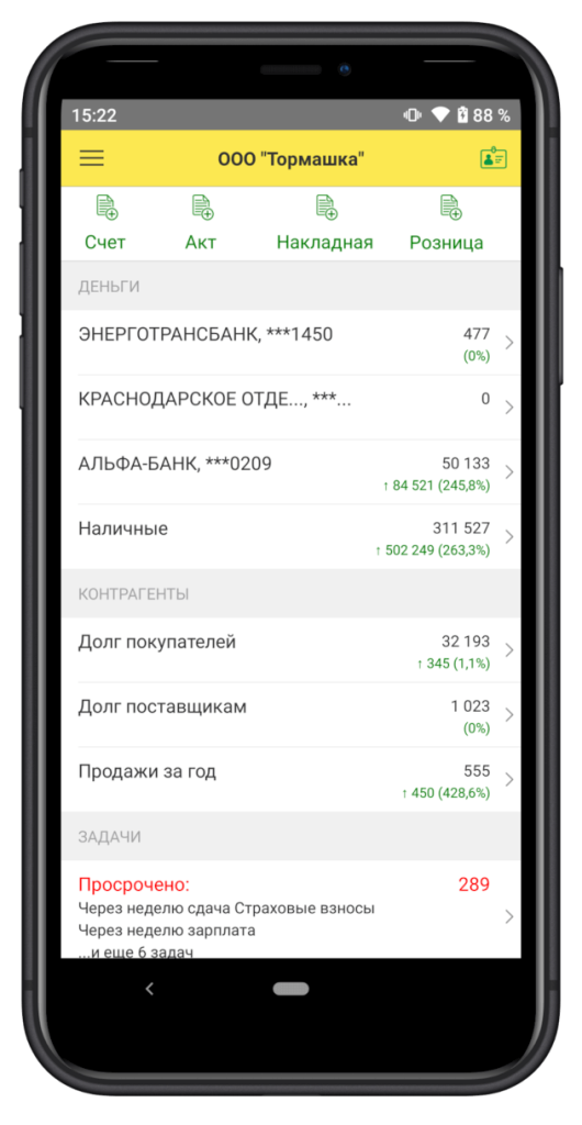 В приложении имеется все, что нужно для ведения учета: расчет и уплата налогов, подготовка и отправка отчетности, касса и обмен с банком, счета и акты сверки, акты и накладные, ТОРГ-12 и УПД, онлайн-кассы и интеграция с сервисом 1С:Касса. Для самозанятых, предпринимателей на УСН и Патенте и организаций.