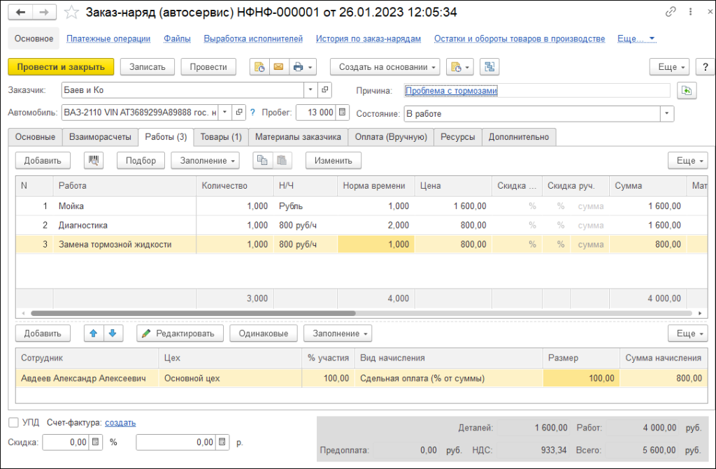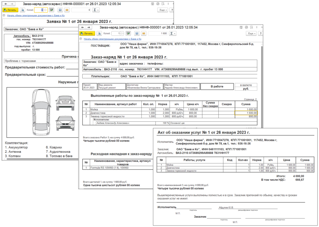 - Формирование необходимых печатных форм документа «Заказ-наряд»: акт осмотра, рабочий лист, заказ-наряд, квитанция к заказ-наряду.