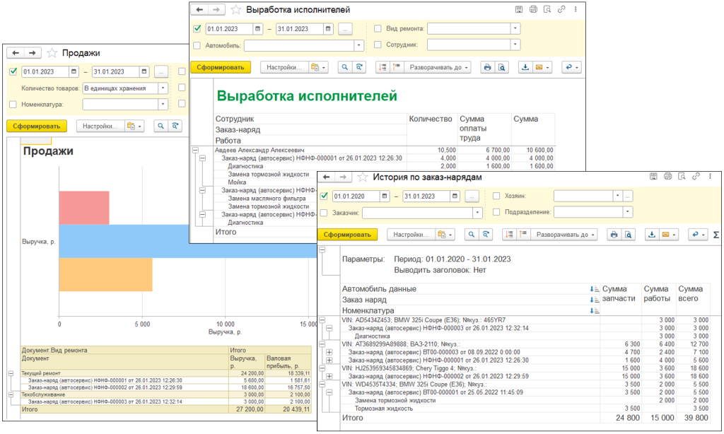 - Использование специфичных для автосервиса справочников: модели автомобилей, нормо-часы, цеха, виды ремонта. Интеграция с каталогами работ и норм времени (загрузка данных):
