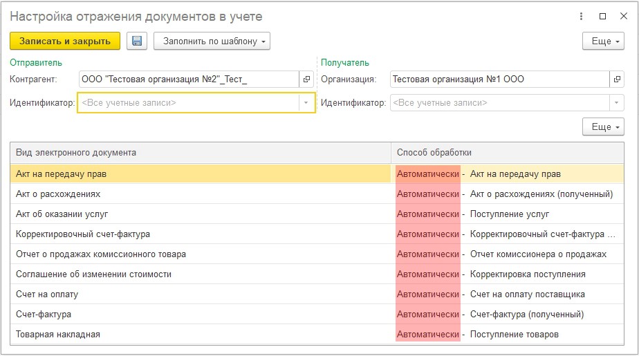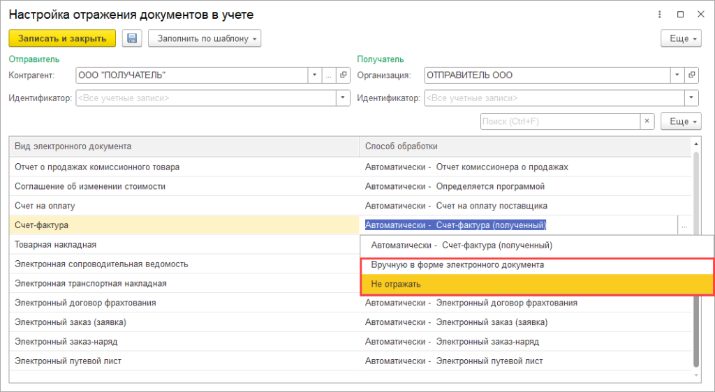 Стандартными настройками предусмотрен автоматический способ отражения в учётной системе с указанием вида документа.