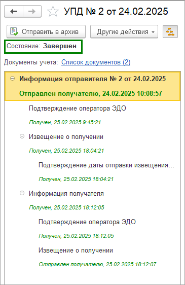 Завершен – данное состояние означает, что необходимые действия по данному документу выполнены со стороны всех участников обмена. Документооборот завершен.