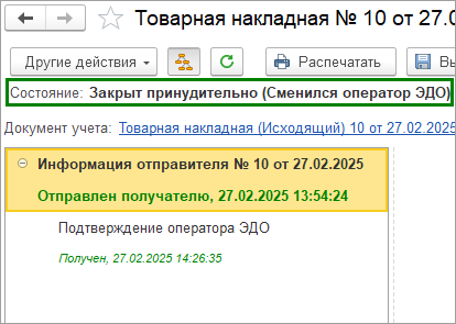 Закрыт принудительно — данное состояние обозначает, что электронный документ изъят из активного документооборота, при этом иные участники обмена (контрагент и оператор ЭДО) не получат уведомлений о том, что по данному документу не требуется действий.