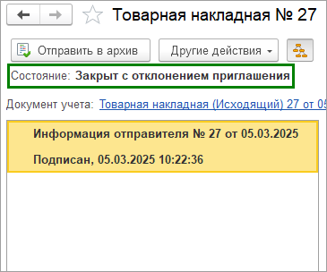 Закрыт с отклонением приглашения — данное состояние означает, что контрагенту было направлено приглашение для обмена, после чего был сформирован и подписан документ, однако контрагент отклонил приглашение.