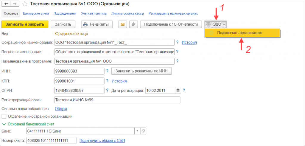 Подключение к электронному документообороту выполняется из карточки организации «ЭДО – Подключить организацию».