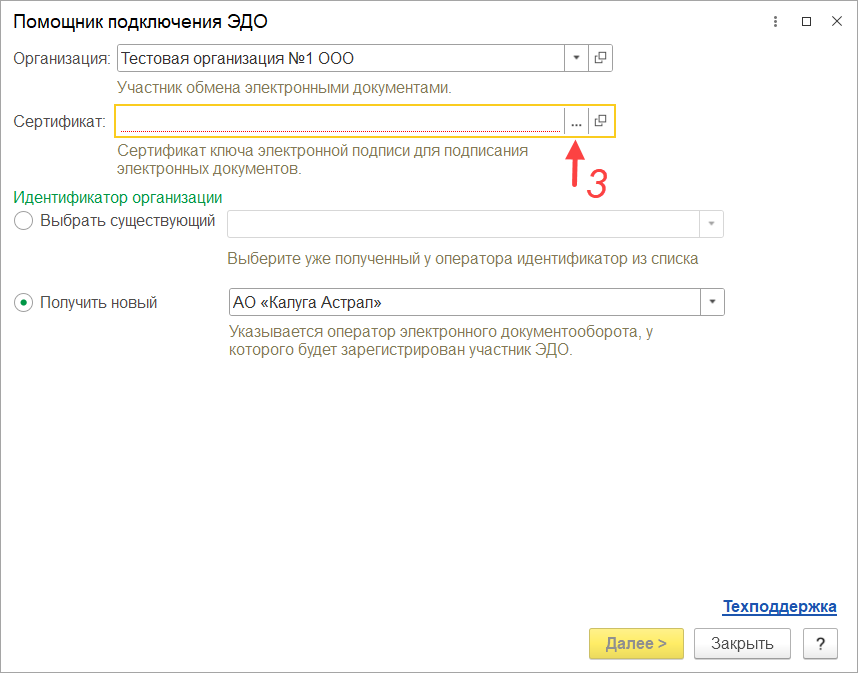 Если организация ранее была подключена к ЭДО, то имеется возможность «Выбрать существующий» идентификатор и восстановить учётную запись и настройки с контрагентами. Если подключение происходит впервые, необходимо «Получить новый» идентификатор.