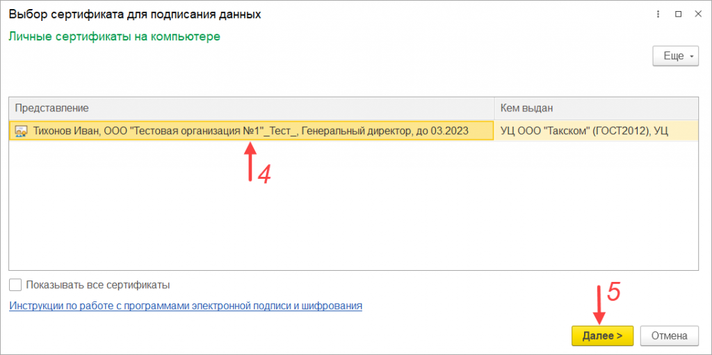 Из списка сертификатов необходимо выбрать нужный и нажать «Далее»