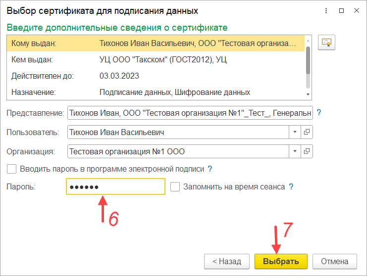 В открывшемся окне следует ввести пароль от электронной подписи и нажать «Выбрать».