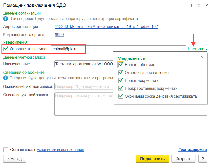 Юридический адрес, код налогового органа, e-mail для уведомлений будут автоматически подобраны из карточки организации. Затем можно подключить и настроить уведомления на электронную почту. Данные настройки также можно выполнить и изменить после подключения.