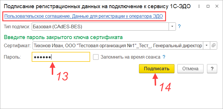 В открывшемся окне «Подписание регистрационных данных на подключение к сервису 1С-ЭДО» требуется ознакомиться с пользовательским соглашением на подключение к сервису 1С-ЭДО, после чего ввести пароль закрытой части ключа электронной подписи и нажать «Подписать». Если при выпуске сертификата пароль не был задан, то данной поле нужно оставить пустым.