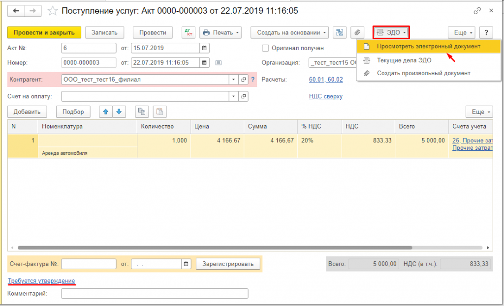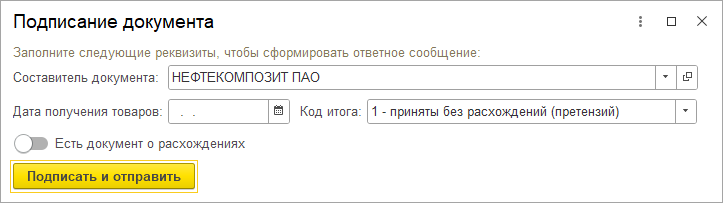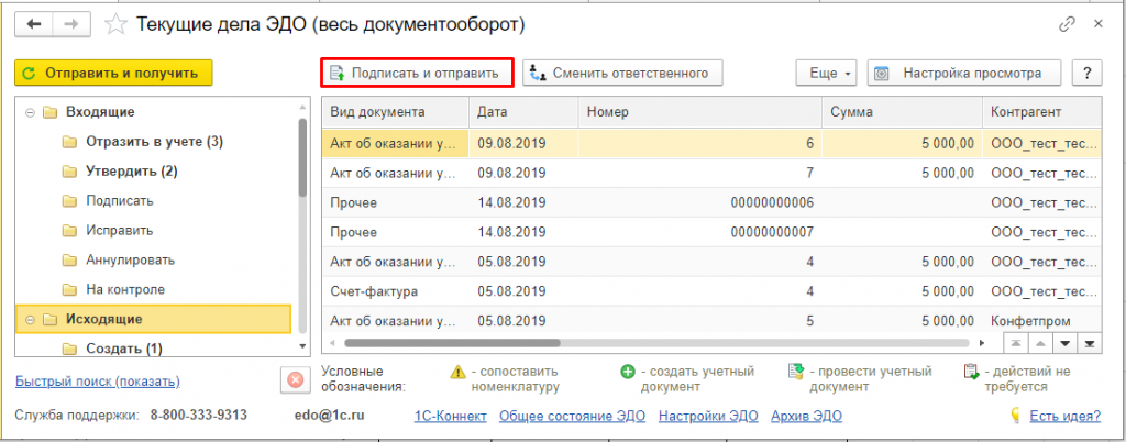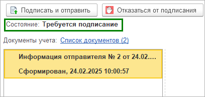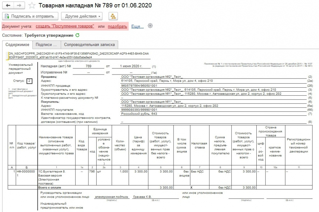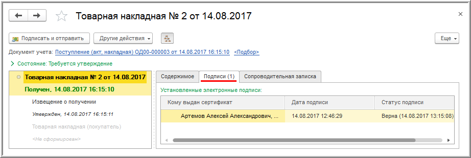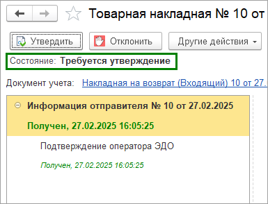 Требуется утверждение — данное состояние означает, что в информационную базу загружен входящий электронный документ. Если пользователь согласен с содержанием электронного документа необходимо нажать «Утвердить», после чего станет доступна кнопка «Подписать и отправить».