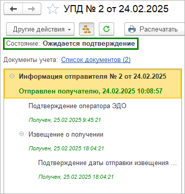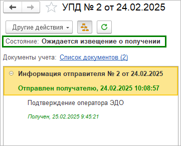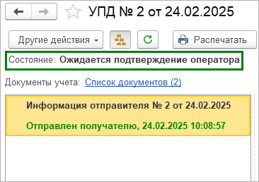 Ожидается подтверждение оператора — данное состояние означает, что документ отправлен оператору ЭДО. Пользователь ожидает получение служебного документа «Подтверждение даты получения» от оператора ЭДО. Требуется нажать «Отправить и получить».