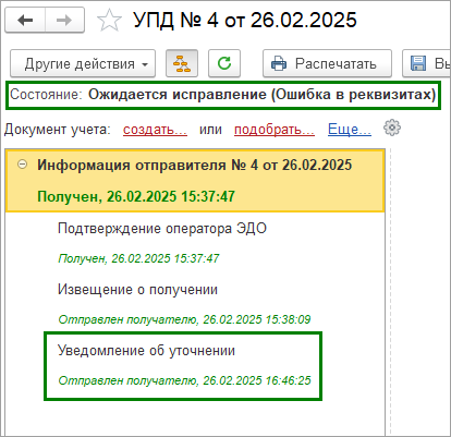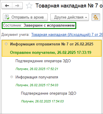 Завершен с исправлением — данное состояние означает, что отправитель сформировал корректировочные документы с которыми согласился контрагент.