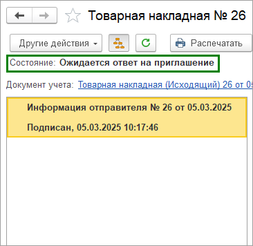 Ожидается ответ на приглашение — данное состояние означает, что документ подготовлен к отправке, но настройка ЭДО со статусом «Принято» отсутствует. В этом случае при формировании документа контрагенту отправляется приглашение. После того как контрагент примет приглашение, данный документ отправится автоматически.