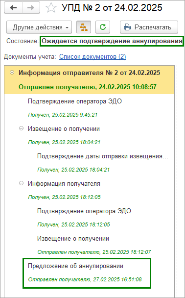 Сформированное предложение об аннулировании подписывается инициатором аннулирования и отправляется через оператора ЭДО контрагенту. Состояние ЭДО переходит в статус «Ожидается аннулирование».