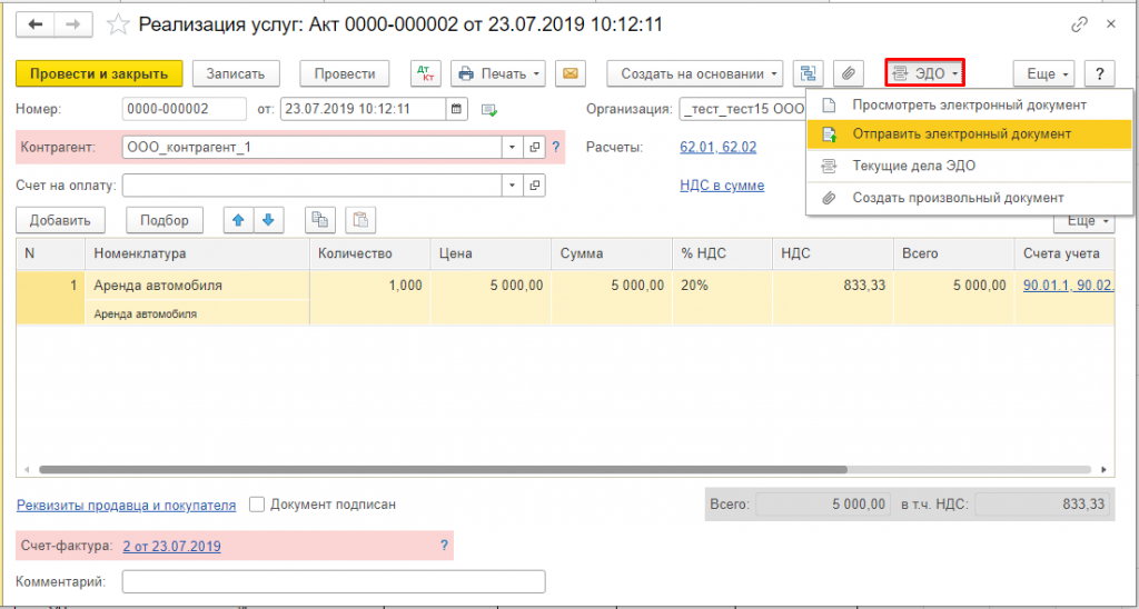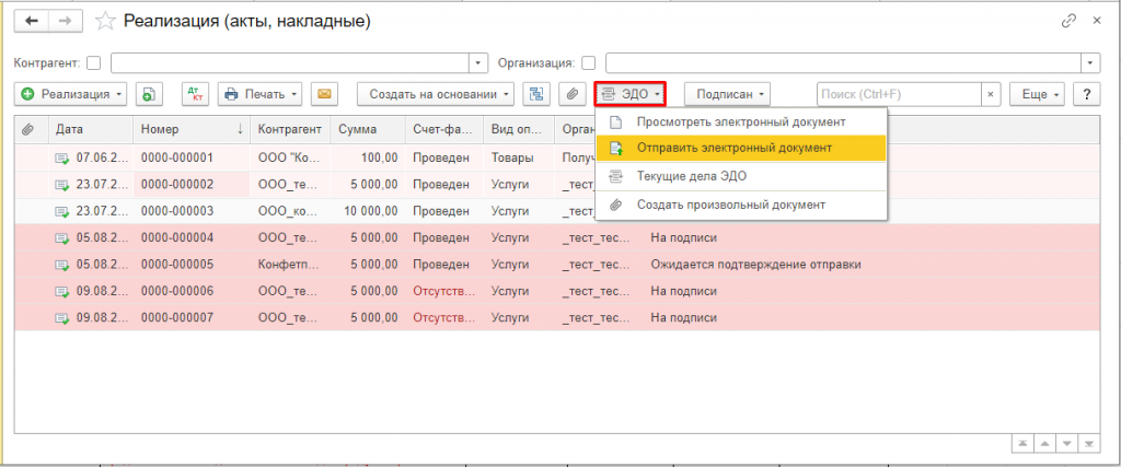 - При выполнении команды Отправить электронный документ меню ЭДО в таблице списка документов реализаций (рис. 1).