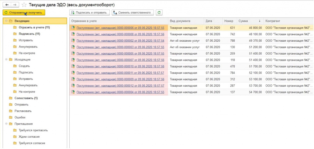 Получение электронных документов производится при выполнении команды Отправить и получить из формы списка документов «Текущие дела ЭДО», открываемого по гиперссылке панели команд Текущие дела ЭДО (раздел Продажи — подраздел Сервис или раздел Покупки — подраздел Сервис) (рис. 1).