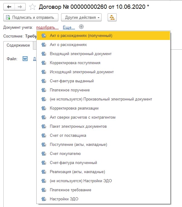 - «Вручную в форме электронного документа» — позволяет связать входящий электронный документ с уже созданным документом информационной базы.