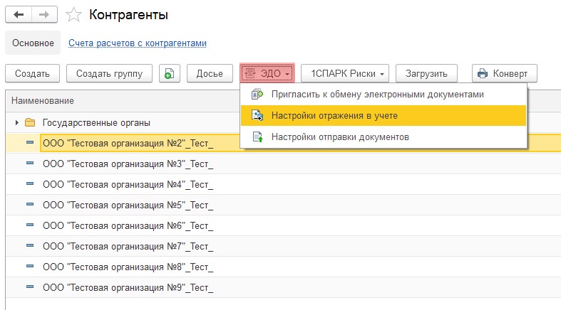 В версиях программных продуктов, использующих Библиотеку электронных документов 1.6, это можно сделать, перейдя в раздел Справочники — Контрагенты. В открывшемся списке необходимо выбрать контрагента, с которым требуется установить определенный способ обработки входящих электронных документов, нажать ЭДО – Настройки отражения в учёте.