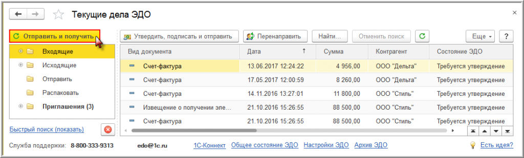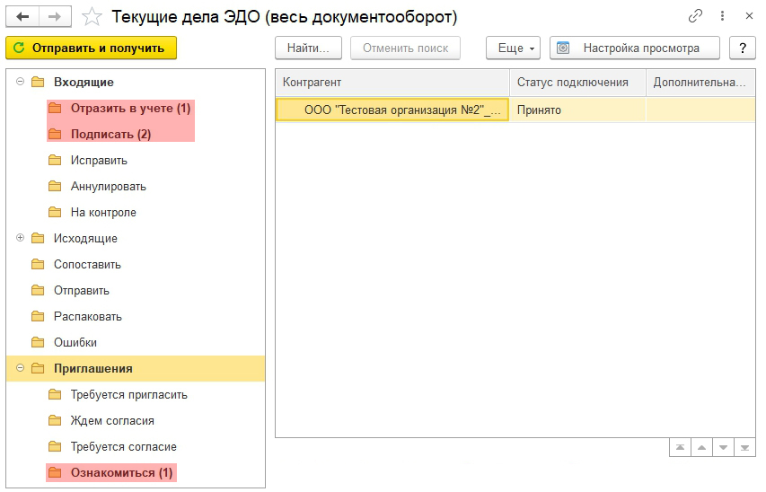 Для того чтобы получить входящее приглашение от контрагента необходимо перейти в Текущие дела ЭДО и нажать «Отправить и получить».