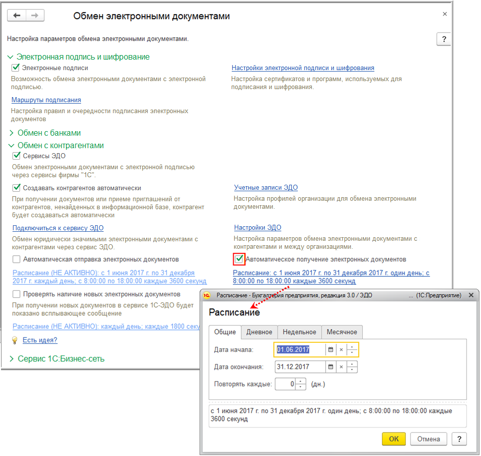 Для клиент-серверного режима работы также можно установить расписание получения электронных документов, выполнив соответствующую настройку параметров обмена электронными документами с контрагентами (раздел Администрирование — гиперссылка Обмен электронными документами) (рис. 2).