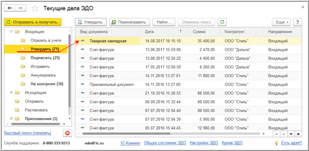 Полученный электронный документ, в зависимости от типа, может автоматически помещается в папку «Утвердить» формы списка документов «Текущие дела ЭДО» (рис. 3).