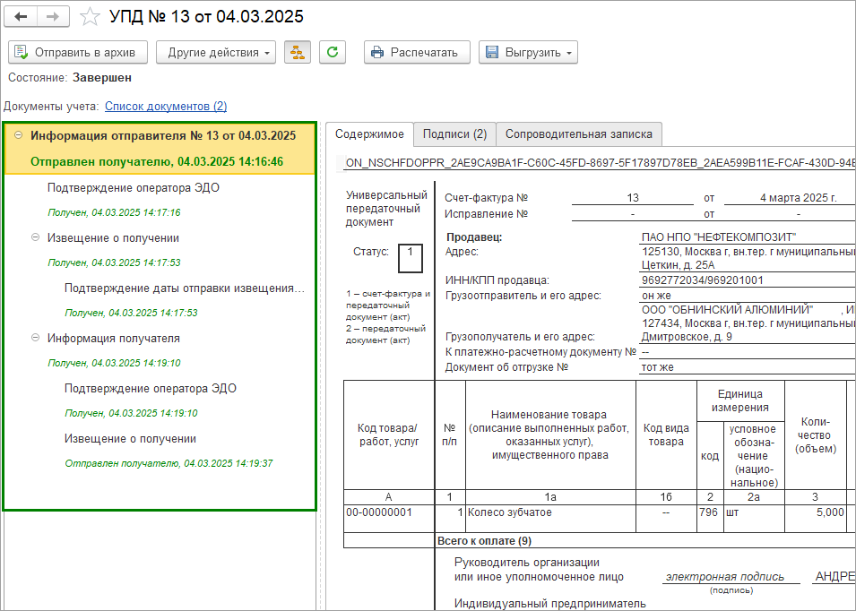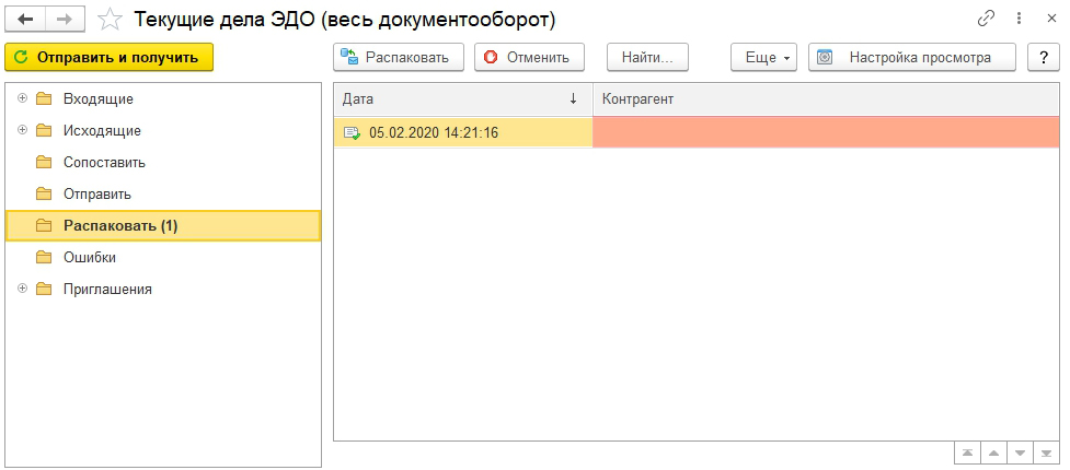 С сервера оператора ЭДО в информационную базу будут загружены отсутствующие настройки, и документ успешно распакуется.