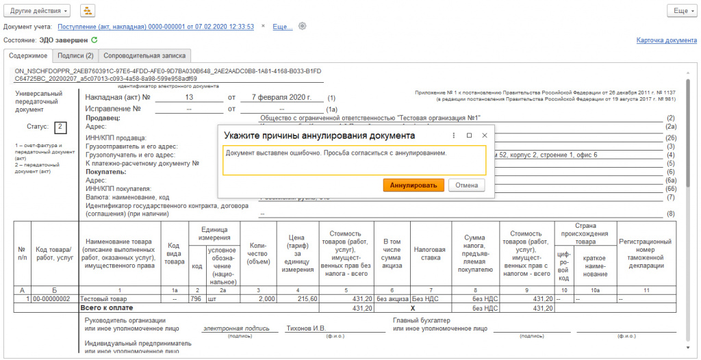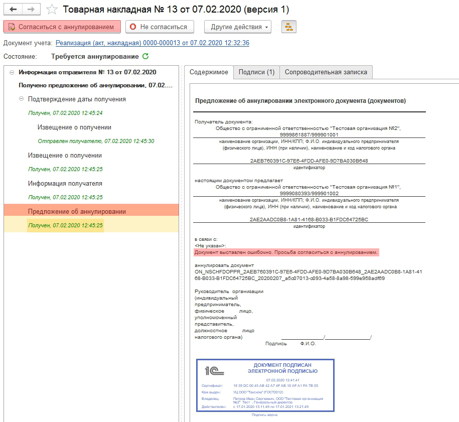 Если контрагент согласен аннулировать документ, он подписывает предложение об аннулировании.
