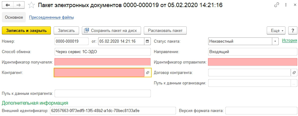 Открыв соответствующий пакет электронных документов можно убедиться, что отсутствуют обязательные поля, необходимые для распаковки пакета и последующего корректного принятия к учету (идентификатор получателя, идентификатор отправителя, контрагент). Для заполнения этих полей в некоторых случаях необходимо наличие в информационной базе приглашения между участниками ЭДО по данному документу в статусе «Присоединен».