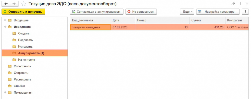 Также инициировать процедуру аннулирования возможно сразу после отправки электронного документа контрагенту. При таком сценарии, Ваш контрагент получит отправленный документ в папку «Аннулировать» раздела входящие Текущих дел ЭДО.