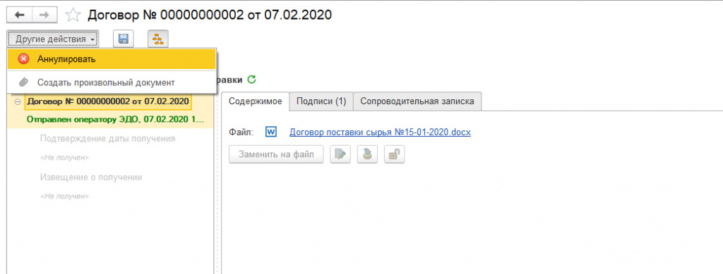 Для этого необходимо открыть соответствующий электронный документ, нажать «Другие действия», а затем «Аннулировать».