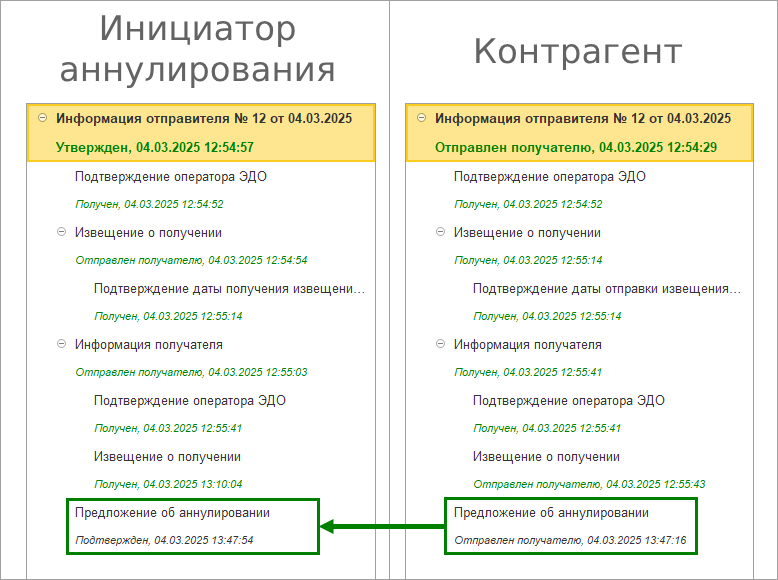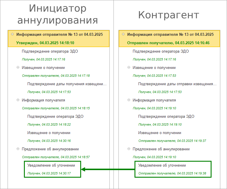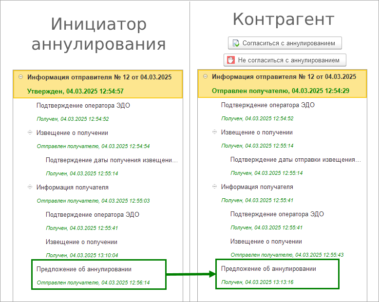 Ожидается подтверждение аннулирования — данное состояние означает, что одна сторона сформировала предложение об аннулировании документа и отправил в адрес контрагента. От контрагента ожидается согласие или отказ от аннулирования.
