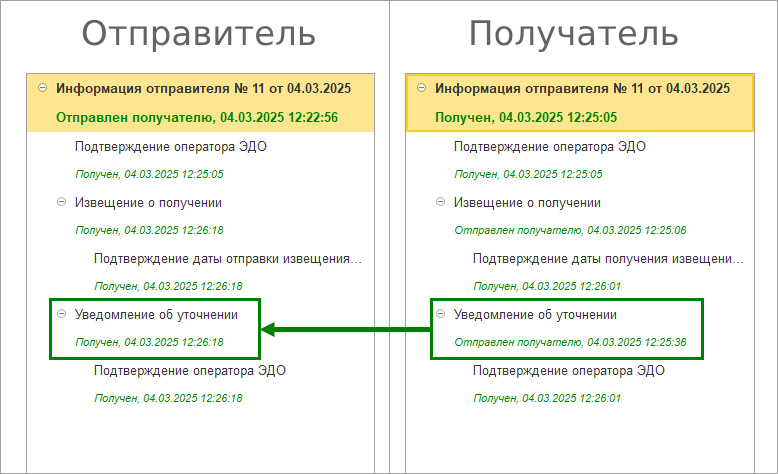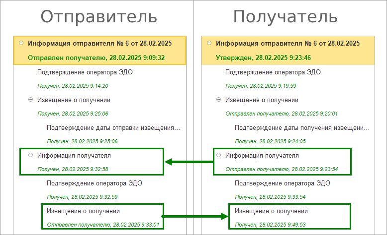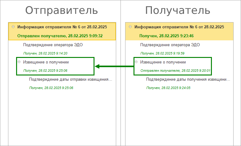 Если было запрошено извещение о получении, то получатель документа формирует, подписывает и отправляет его в адрес контрагента. Получив извещение о получении, оператор ЭДО формирует соответствующие подтверждения для участников обмена.