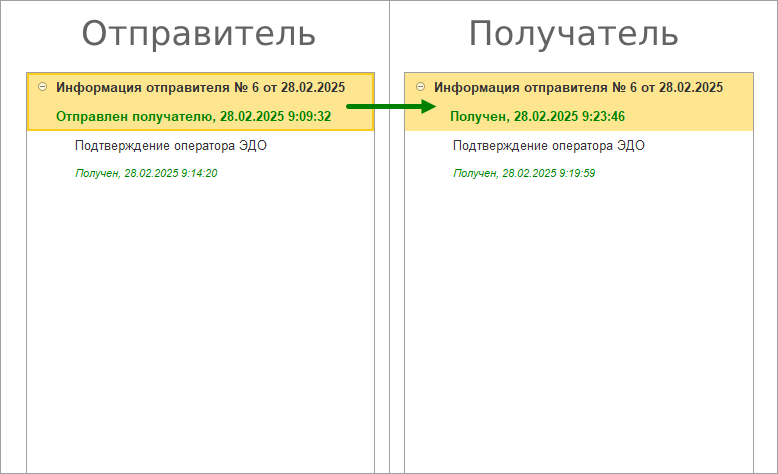 Инициатор обмена формирует подписывает и отправляет документ через оператора ЭДО в адрес получателя. Оператор фиксирует дату и время отправки документа и передаёт отправителю подтверждение даты получения, а получателю подтверждение даты отправки.