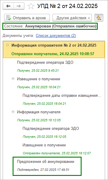 Аннулирован — данное состояние означает, что документооборот аннулирован как со стороны отправителя, так и со стороны получателя электронного документа.