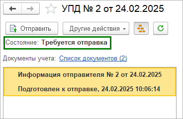 Требуется отправка – данное состояние появляется только в том случае, когда пользователь включил «Отложенную отправку электронных документов». Отложенная отправка электронных документов включается в Администрирование — Обмен электронными документами — Вкладка «Обмен с контрагентами».