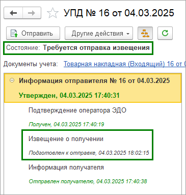Требуется отправка извещения — извещение о получении было подписано, но не передано оператору ЭДО. В актуальных версиях программы извещение формируется и подписывается автоматически при обработке электронного документа. Данный статус может возникнуть, если в процессе отправки возникли технические проблемы. Необходимо нажать «Отправить»..