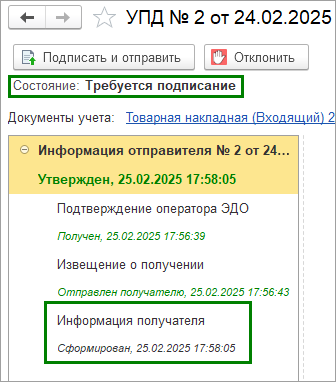В случае согласия с документом, получатель формирует, подписывает и отправляет информацию получателя в адрес контрагента. Получив информацию получателя, оператор ЭДО формирует соответствующие подтверждения для участников обмена.